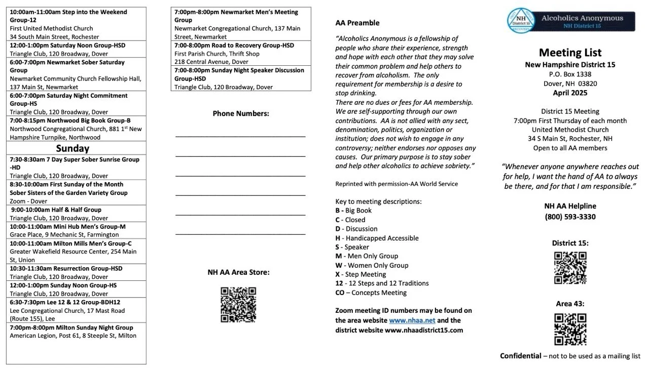 This website is all about what is happening in AA in NH District 15.